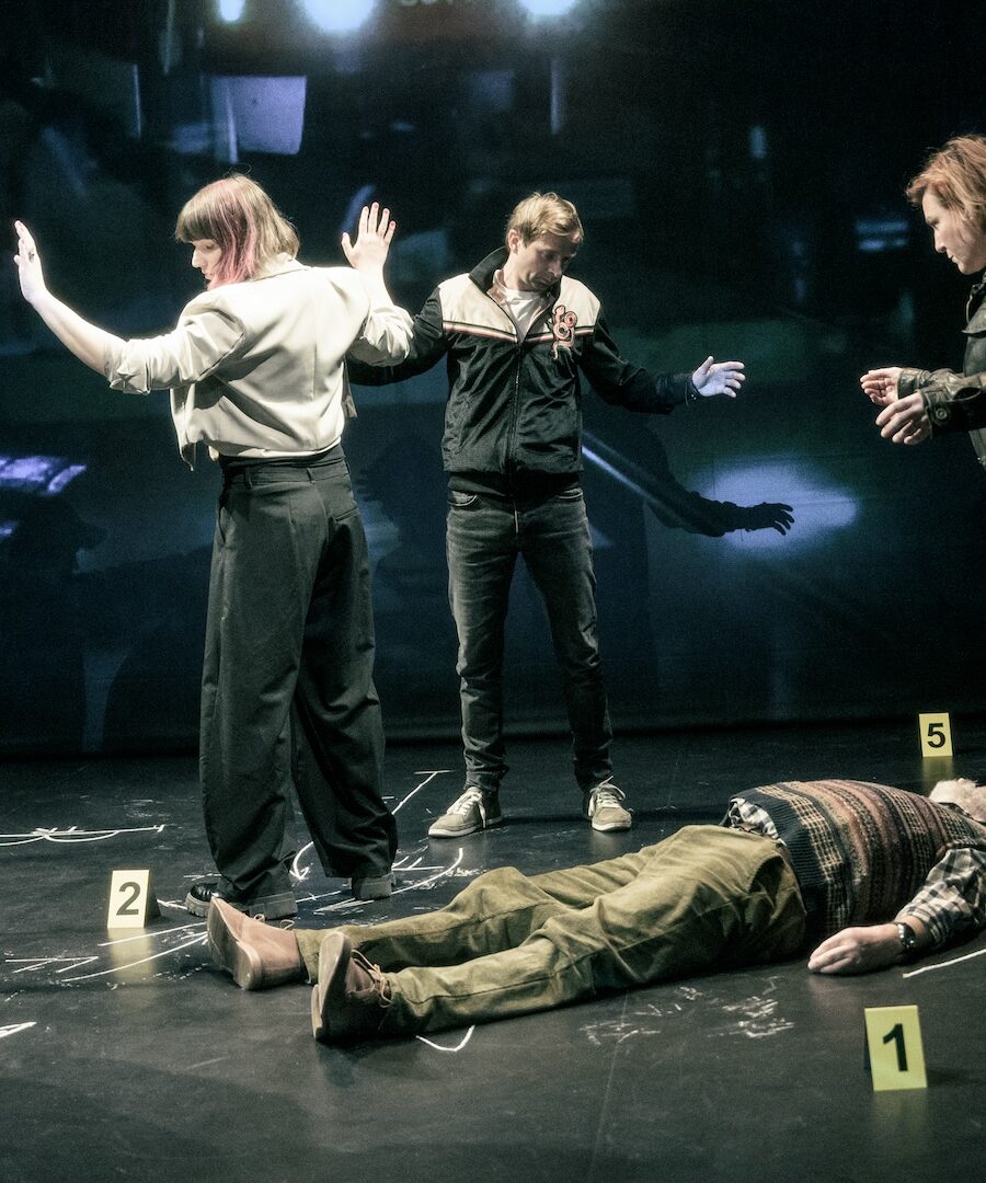 Faleš prodchne i výrazy, které se na tvářích performerů objevují jako odnikud, bez zjevné motivace, vykouzlené spínačem. Falešné úsměvy provázejí i exaltovanou komunikaci s publikem. Jedna z performerek zpívá, světla září i do publika a tanečníci jsou náhle plní energie. Akrobatické výstupy však zůstávají bez potlesku a v tichu, protože faleš by se dala krájet. Až nyní nás vítají v cirkuse, aby okomentovali i jeho paradoxní struktury, „myšlenku mezi snem a kontraktem“. Kouzlo a kalkulace v jednom, nomádství jako styl i nutnost. V tomto duchu se na jevišti mísí i jazyky: čeština, angličtina, ruština, polština… Zní melancholická hudba, dvě dívky se společně točí na hrazdě a v sále se stmívá.
