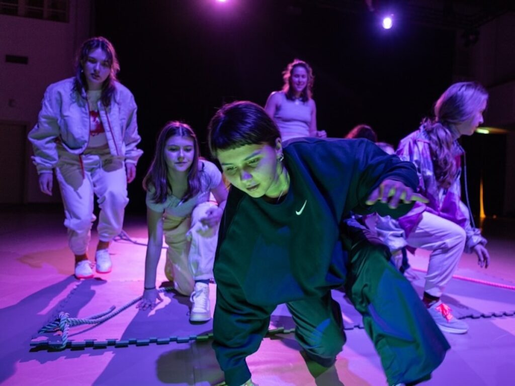 Onou ústřední postavou oscilující mezi odpojením a připojením je performerka a choreografka Eva Stará, která na inscenaci pracovala s režisérkou nonverbálního divadla Jindřiškou Křivánkovou. Spolu s Evou Starou vystupuje v projektu osm mladých tanečnic, zřejmě ještě teenagerského věku, které iniciují kontakt, překračují hranice a tak či onak vyvolávají pnutí zápasu o volný prostor. Někdy je interakce a společná aktivita vítaná, jindy zase pohár přeteče a protagonistka si své území brání jako divoké zvíře. Metafora je dobře čitelná a je třeba ocenit právě práci s nastupující generací. Tanečnice se pohybují přirozeně, chvílemi v intenci taneční hry, jindy jen volného výdeje energie nebo rytmického tance až klubového charakteru. Ztotožnit se lze s oběma stranami, protože na každé z nich jsme někdy už byli.