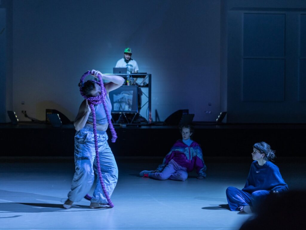Performerka ze zavazadla vyjímá růžové silné lano, téměř obřadně. Následují další v různých tloušťkách i barvách, jako symboly připoutání, které je ovšem možné také fyzicky odříznout. Kolika takovými lany jsme asi přivázáni my k lidem, místům a věcem… Několik modrých lan je svázáno ve smyčce jako uzel, Eva Stará vybízí diváky k házené s nimi. Když však nakonec uzly rozváže, může z nich vytvořit kolem sebe čtverec, jako základ stanu, jako bezpečnou hranici. Opravdu bezpečnou? Zatím si uvnitř sama pro sebe tančí, v lehce streetovém duchu, ale neunikla pozornosti dívčí družiny kolem.