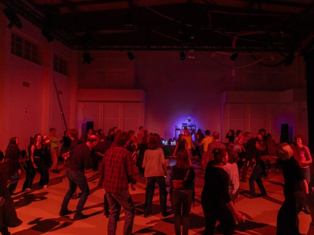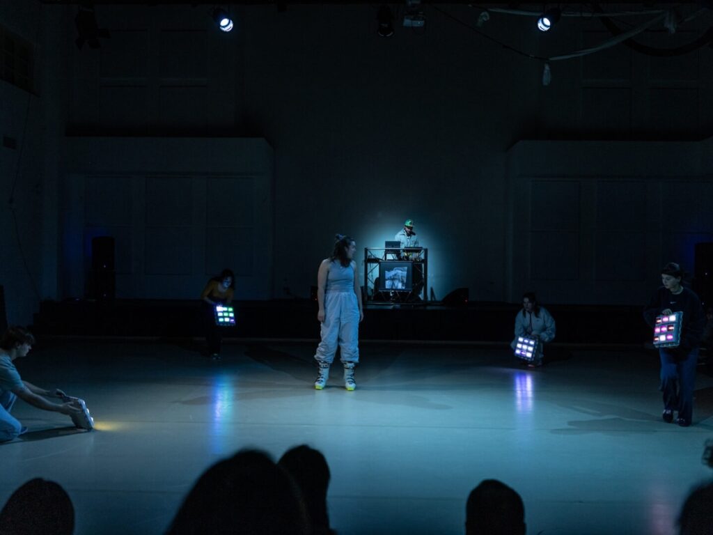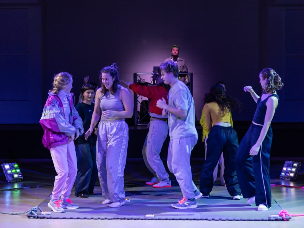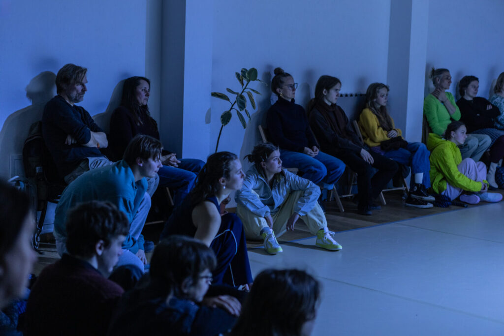 V poslední části představení vstupují do hry další rekvizity a performerka ustupuje z pozice osamělého hráče ke kontaktu se společenstvím. Lyžařské boty jsou snad momentálním nápadem a experimentem: tvůrkyně zjistily, že s vratkou a těžkopádnou obuví se dá kupodivu vtipně pracovat, otáčet se na špičkách i patách a kroužit v prostoru. Ten teď nasvěcují mobilní složené světelné zdroje. Z pěnových desek a dvou provazů lze zase vytvořit vor či loď: dříve nedostupná strážkyně samoty pohybuje korábem vzad a vpřed jako na moři, rychleji s pomyslným větrem a s dívkami na palubě jako posádkou. Rytmus cítí všechny, směr mají společný: ven a znovu ovládnout plochu, roztančí se skupinky a pak se – neodpojí, nebo jen zdánlivě. Naopak vyzvou ke spojení a zapojení diváky, protože hudba je lákavá rytmická a několik návštěvníků neodolá. (Doporučila bych jen výraznější gesto, aby každý pochopil, že opravdu na „parket“ může a nenaruší tím performanci.)